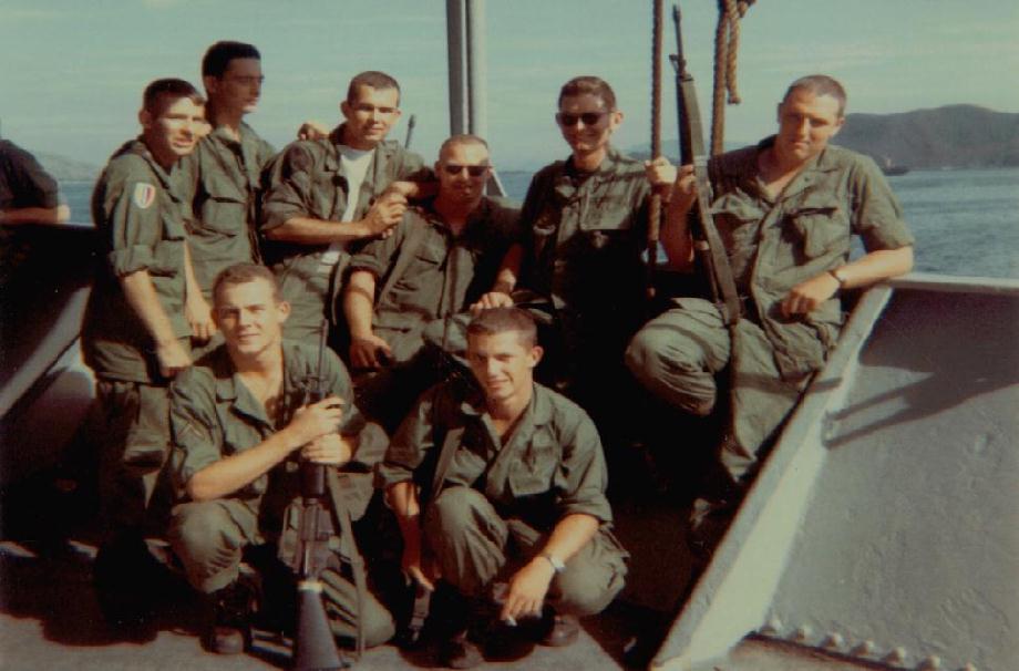 "Boat People". Charlie Company men aboard the U.S.S. General John Pope, September 1967. Standing from left, Jim Sheppard, Walt Landry, Norman Poage, Gerold Jablonski, Toby Hamon and Matt Morrison. I do not recall the kneeling men's names although they both look familiar. The kneelingman on the right is from Califprnia and was a clerk... and I recall talking to him on the phone several years back. |