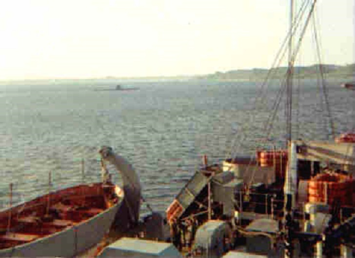 It turned out that the rumor of a submarine escort was true....as we watched it shadow our departure from Okinawa.